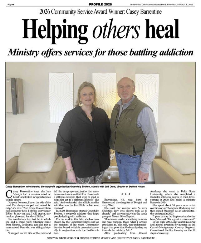 She also speaks to men at a local treatment center about the love of Jesus, and Gracefully Broken provides new work boots for those who need them as well as hygiene items and gifts for Christmas, Easter and other holidays.