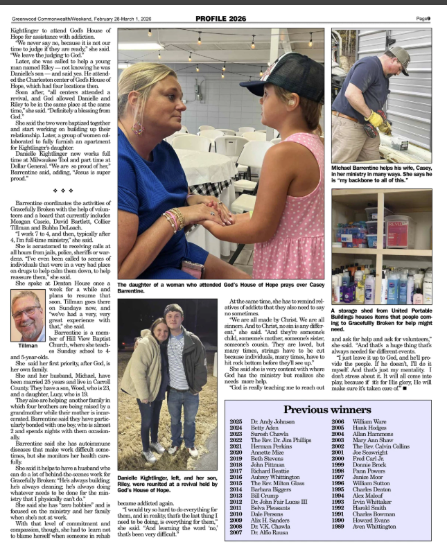 Barrentine coordinates the activities of Gracefully Broken with the help of volunteers and a board that currently includes Morgan Casco, David Bartlett, Collier Tillman and Bubba DeLeach.